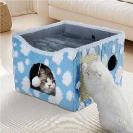 ACA 2 Layers Blue Cat Dog House Foldable Large Covered Small Pet Sleeping Bed Cat Scratcher Cave